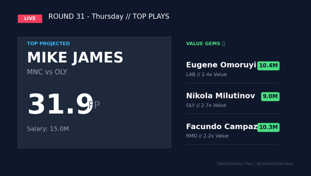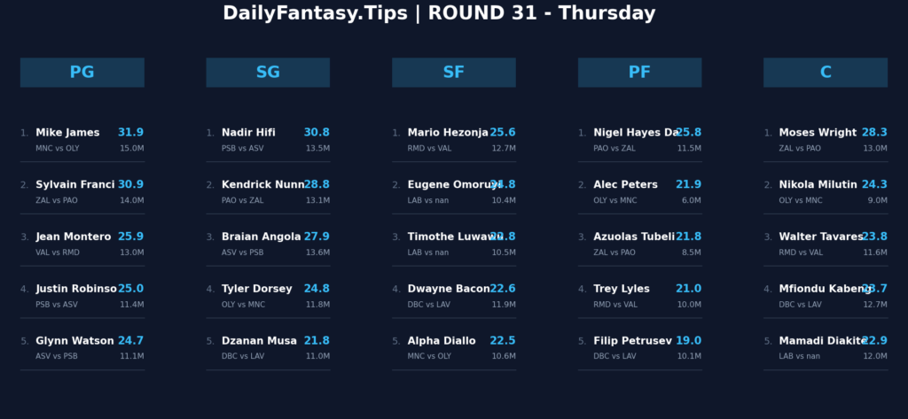 The guard position is where the highest ceilings reside tonight. Mike James leads the projection board with 31.9 FP, remaining the undisputed engine of the Monaco offense. Facing an Olympiacos side that has struggled with elite perimeter shot-creators recently, James is the safest spend-up on the board.